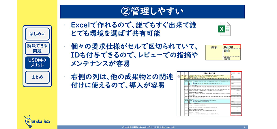 - Excelで作れてIDも付与でき、既存成果物との関連付けもできるので管理がしやすい