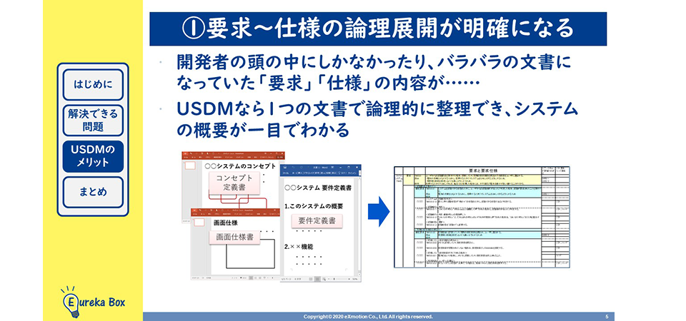 開発者の頭の中にしかなかったり、バラバラの文書になっていた要求や仕様の内容が、USDMならひとつの文書で論理的に整理でき、システムの概要がひとめでわかるようになります。