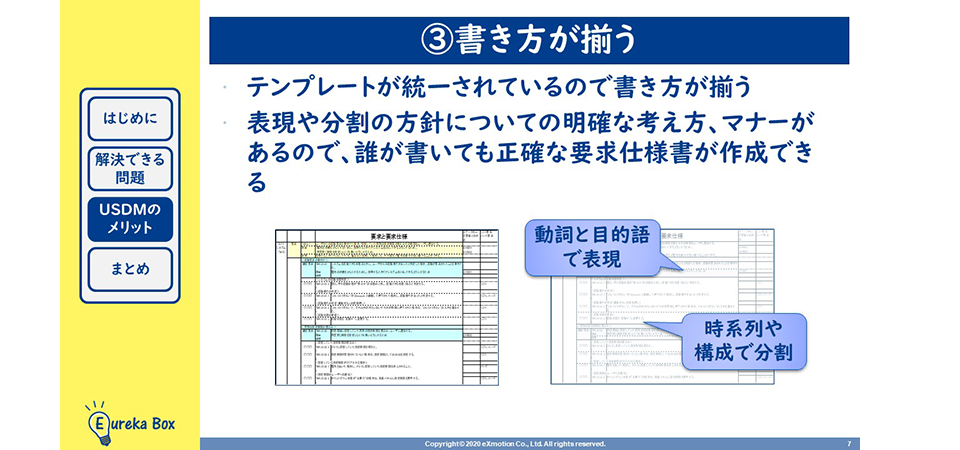 それだけでなく、表現や分割の方針に明確な考え方、マナーがあるので、誰が書いても正確な要求仕様書が作成できるメリットがあります。
