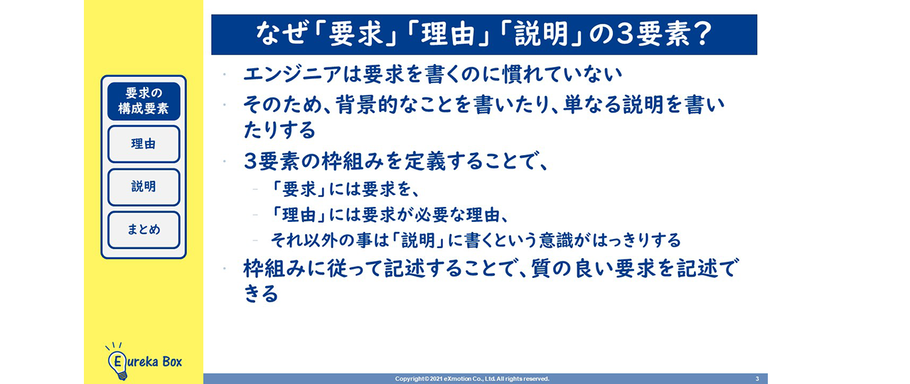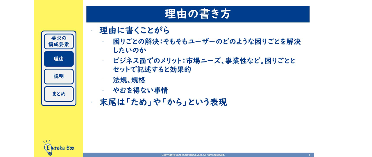 要求の構成要素には、要求、理由、説明の3つがあり、ここでは理由と説明を取り上げました。