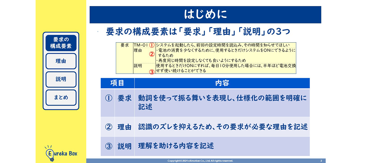 要求の構成要素は、「要求」、「理由」、「説明」の3つです。