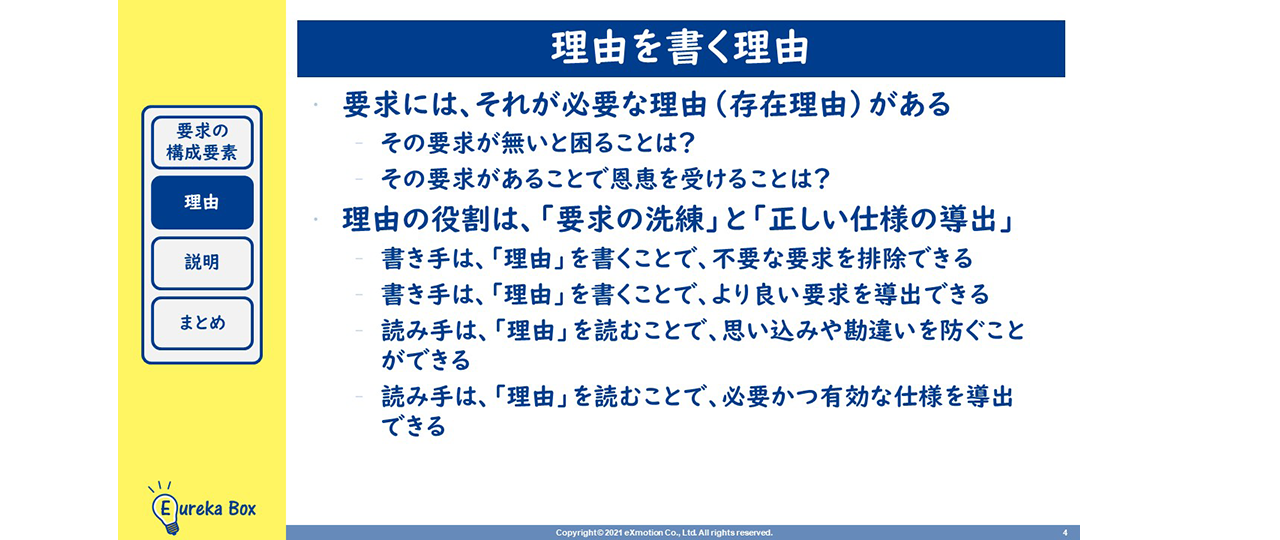 理由の役割は、「要求の洗練」と「正しい仕様の導出」です。要求の書き手は、理由を書くことで、不要な要求を排除したり、より良い要求を導出したりすることができるようになります。一方で、要求の読み手は、理由を読むことで、思い込みや勘違いを防いだり、必要かつ有効な仕様を導出したりすることができるようになります。