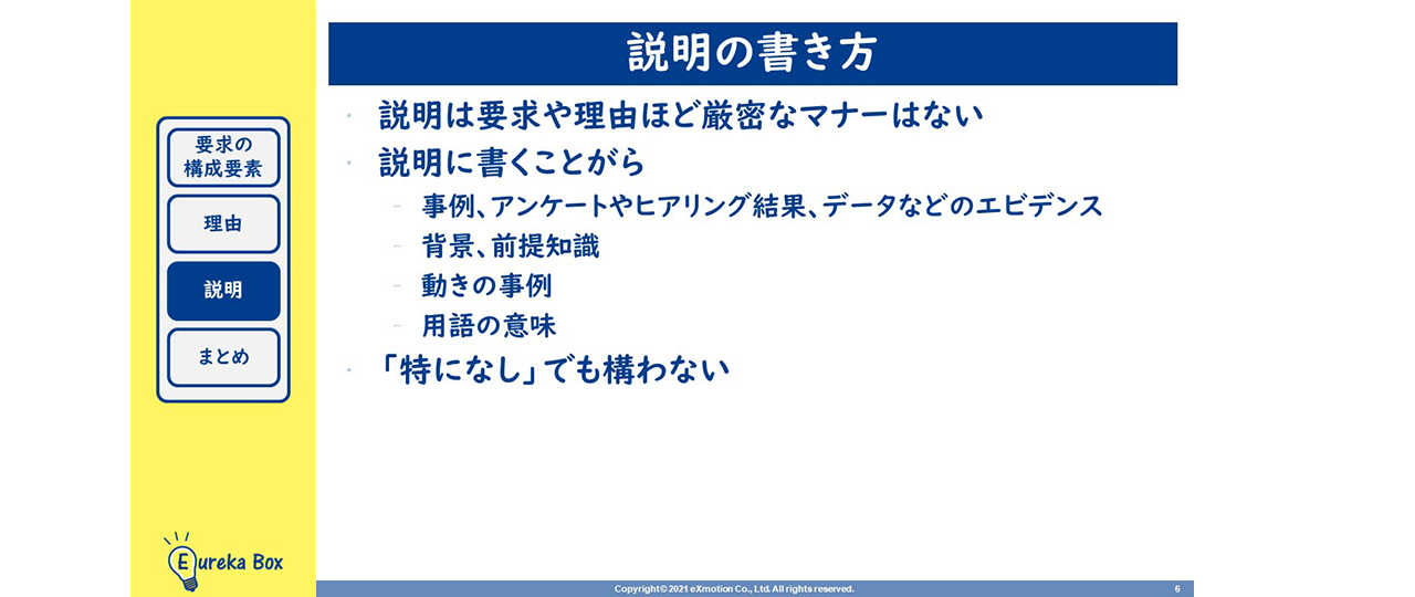 説明に書くことがらには、事例、アンケートやヒアリング結果、データなどのエビデンス、背景や前提知識、動きの事例、用語の意味などがあります。