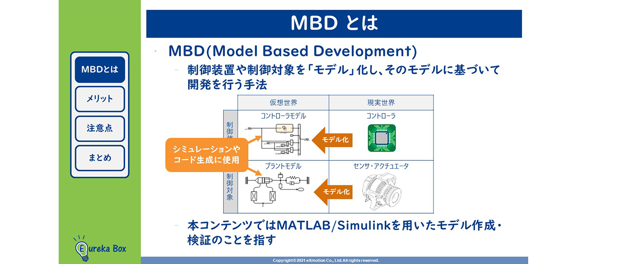 このコラムにおいてMBDというときには、MBDの中でも特にMathworks社のMATLAB/Simulinkを用いたモデルの作成・検証のことを指します。