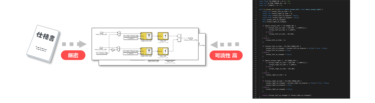 Simulinkモデルはしばしば「動く仕様書」と表現されます。可読性の高い仕様表現でありながら、仕様記述後すぐにシミュレーションを実行することにより、その振る舞いを検証することができます。そのため、実装を待つことなく、開発の上流工程で仕様の正しさを確認することができます。 - 自動的にコードを生成できる