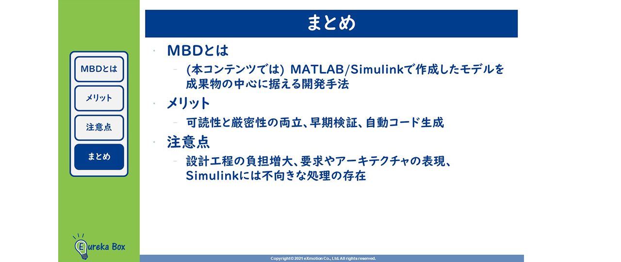 MBDとは、MATLAB/Simulinkで作成したモデルを成果物の中心に据える開発手法であり、そのメリットには、可読性と厳密性の両立、早期検証、自動コード生成、注意点には、設計工程の負担増大、要求やアーキテクチャの表現、Simulinkに不向きな処理があることを見てきました。