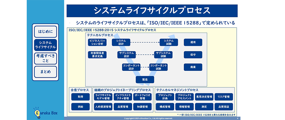 システムライフサイクルプロセスは、「ISO/IEC/IEEE15288」で定められています。