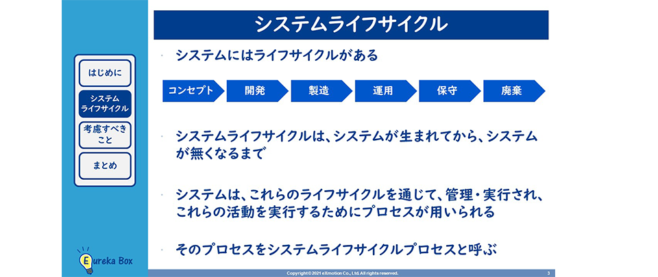 今回は、システムのライフサイクルとは何か、システムズエンジニアリングにとって、なぜライフサイクルが重要なのかについて説明します。