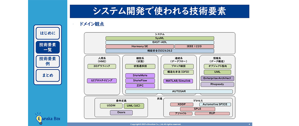 ここで示している様に、システムレベルで、どのようなドメインがあるかを明確にし、そのあとに、ドメインに適した技術要素を用いることが大事です。例えば、HMIならばUIプロトタイピングを用いる、など、必要な技術要素を検討する際には、ドメイン観点で検討することも有効です。