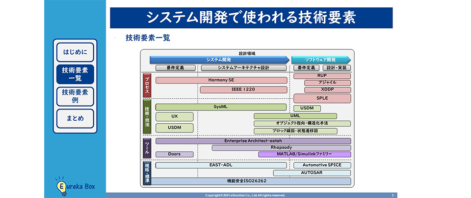 要件定義の技法にはUSDMがあります。また、SysMLやEAST-ADLは、システム開発における要件定義からシステムアーキテクチャ設計で使われる技術要素です。