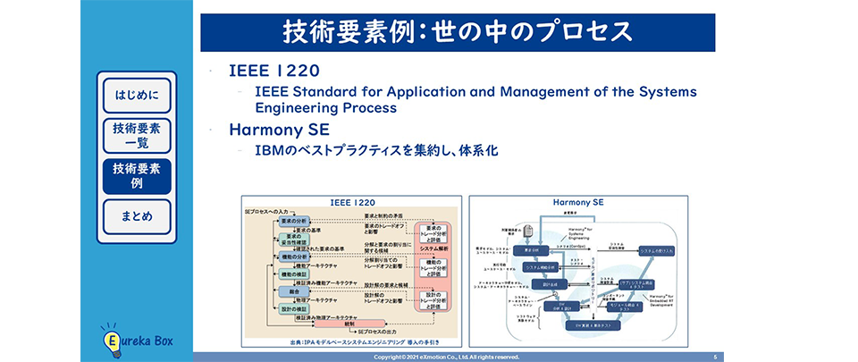 エクスモーションが提供するシステムズエンジニアリングのプロセスは、現場での経験や、これら、IEEE 1220、Harmony SEなどを参考にして構築したものです。