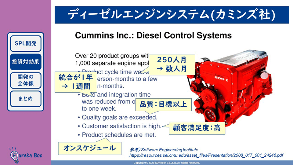 こちらは、米国カミンズ社のディーゼルエンジンシステムの事例です。1,000以上のエンジンアプリケーションを含む、20以上の製品グループについて、
