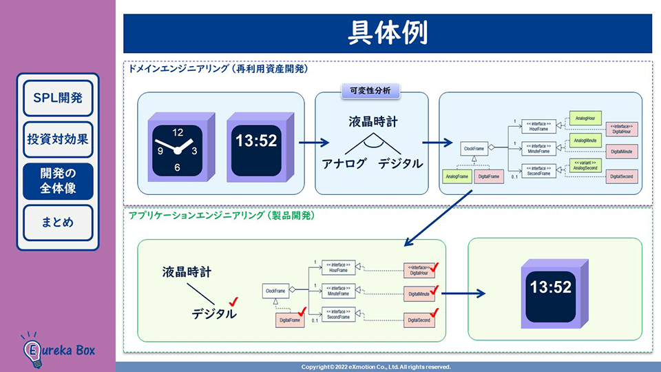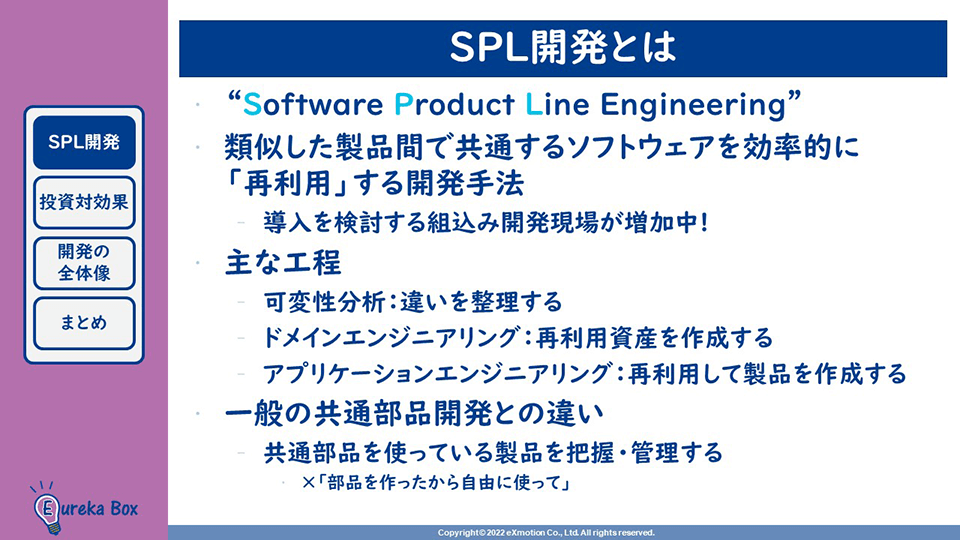 皆さんの開発現場でも共通部品を開発するケースはあると思いますが、それとSPL開発との違いは、共通部品を使っている製品を把握・管理するという点です。「部品を作ったから自由に使って」といった、使い方に統制を取らない部品開発ではなく、「部品を必要とする製品それぞれの要望を満たせるように意識して作ろう」といった、製品を広い目線で俯瞰した、統率の取れた部品開発を行います。