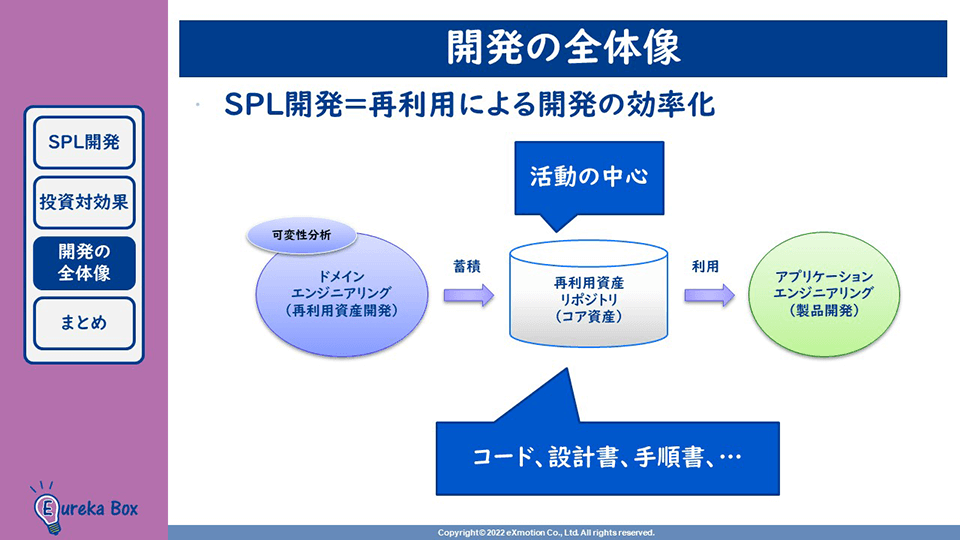 SPL開発は、共通のソフトウェアを作り、類似製品間で再利用することで、開発の効率化を図る技術体系です。可変性分析、ドメインエンジニアリング、アプリケーションエンジニアリングの3つが、特徴的な取り組みでした。SPL開発の活動の中心となるのが、再利用資産、すなわち「コア資産」です。コア資産は、ドメインエンジニアリングで蓄積され、アプリケーションエンジニアリングで再利用されます。コア資産に含める対象には、コードのほか、設計書や手順書なども含まれます。