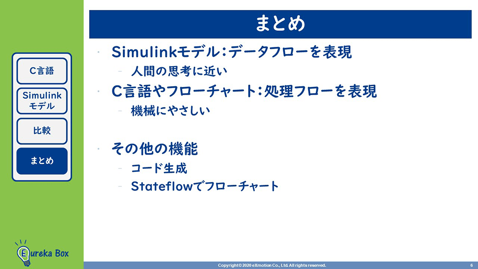 補足ですが、先ほどのSimulinkモデルからコードを生成すると、最初に紹介したC言語のプログラムとほぼ同じコードが生成されます。また、SimulinkにStateflowを組み合わせると、Simulink上でもフローチャートのモデリングができるようになります。