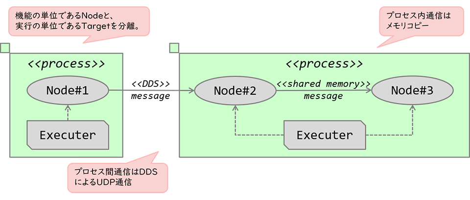 ノード間の通信は、同一ターゲット内であれば、共有メモリを使ったデータコピー(スマートポインタを使った場合はゼロコピー)にすることができます。