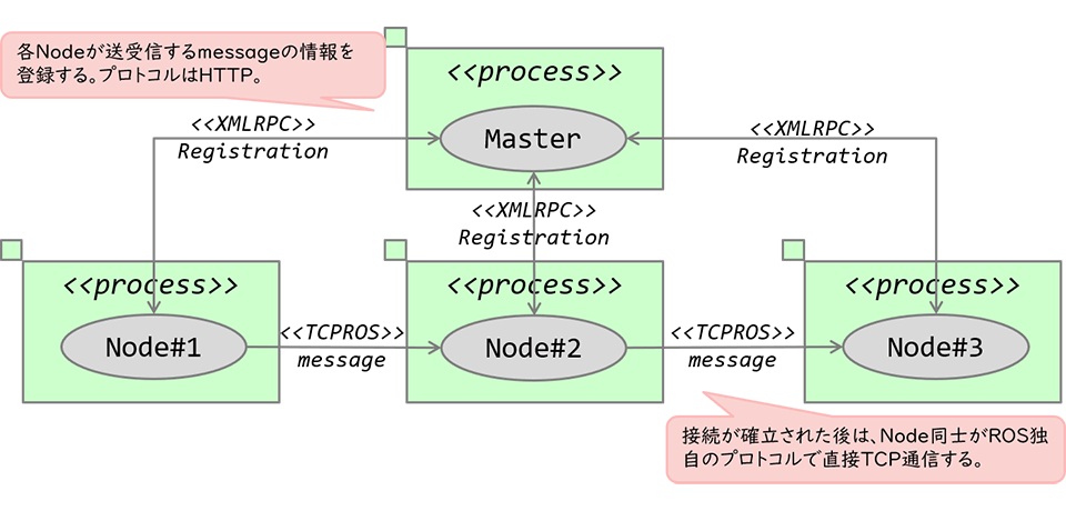 ノード間の接続を確立するときに、マスタ(ネームサービス)が登場します。ノードは、マスタを通じて相手のノードが誰なのかを解決し、接続を確立することになります。ノード間が接続された後は、ノード同士で直接通信を行います。