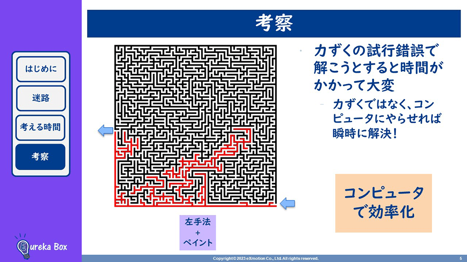 迷路探索の「左手法」を、「ペイント」を使うことで簡単に実現できます。「ペイント」を使って、入口の左の壁にペンキを流し込むと、繋がっているところに瞬時に色が付き、この色を辿っていくと出口までの経路になります。