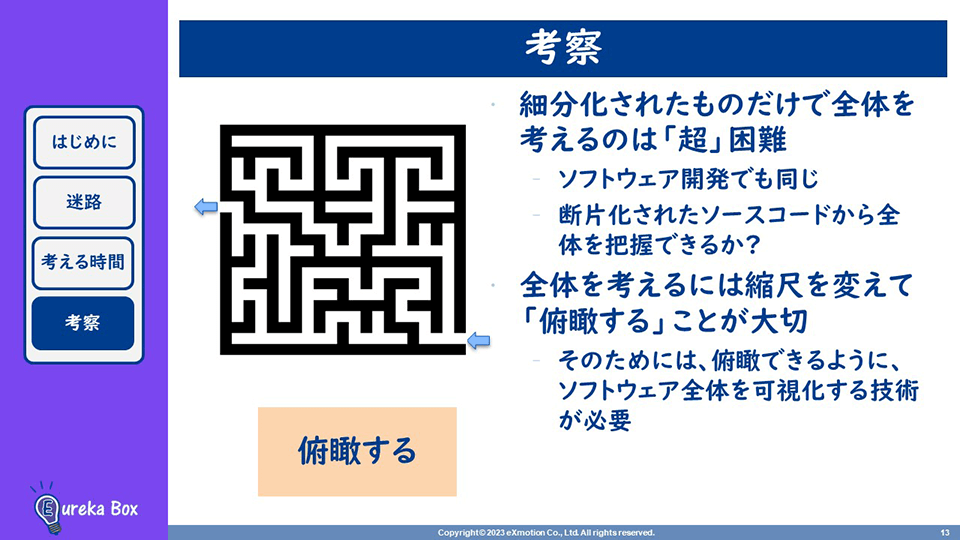 このように、細分化されたものだけで全体を考えるのは「超」困難です。ソフトウェア開発でも同じことが起きていないでしょうか。ファイルに断片化されたソースコードを前に、全体像をつかめず苦労しているのではありませんか。全体を考えるには縮尺を変えて「俯瞰する」ことが大切です。そのために、ソフトウェア全体を可視化する技術を使用します。