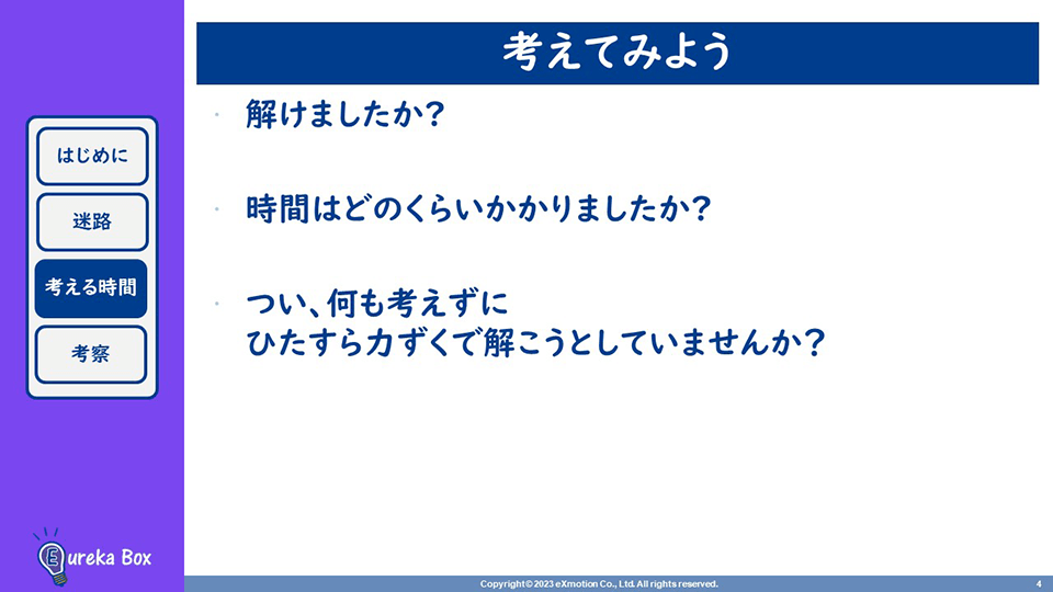 それでは5分間、タイマーをセットして考えてみてください。スタート!