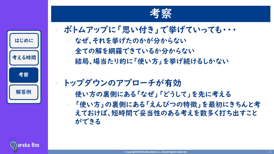 今回のお題では、トップダウンのアプローチが有効です。使い方の裏側にある「なぜ」「どうして」を先に考えるのです。つまり、「使い方」の裏側にある「えんぴつの特徴」を最初にきちんと考えておけば、短時間で妥当性のある考えを数多く打ち出すことができます。