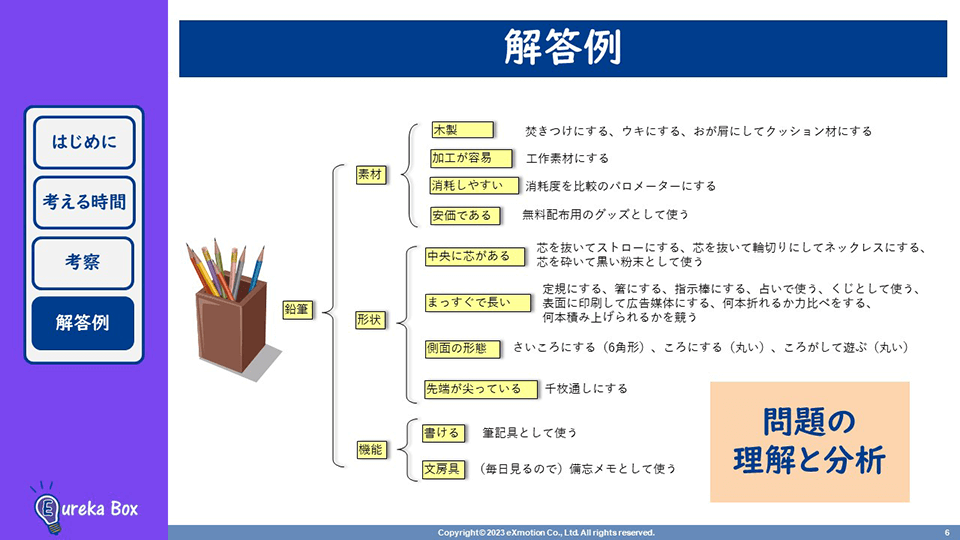 鉛筆という対象についてあらかじめ特徴を理解し分析することで、ここでは23通りの使い方を挙げることができました。