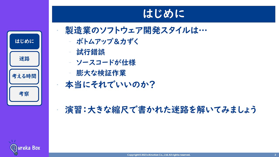 製造業のソフトウェア開発スタイルには、ボトムアップかつ力ずくで試行錯誤を重ねて開発したあと、ソースコードが仕様となり、その結果、検証作業に膨大な工数が取られる、という特徴がありました。本当にそれでいいのか、演習を通じて考えてみます。