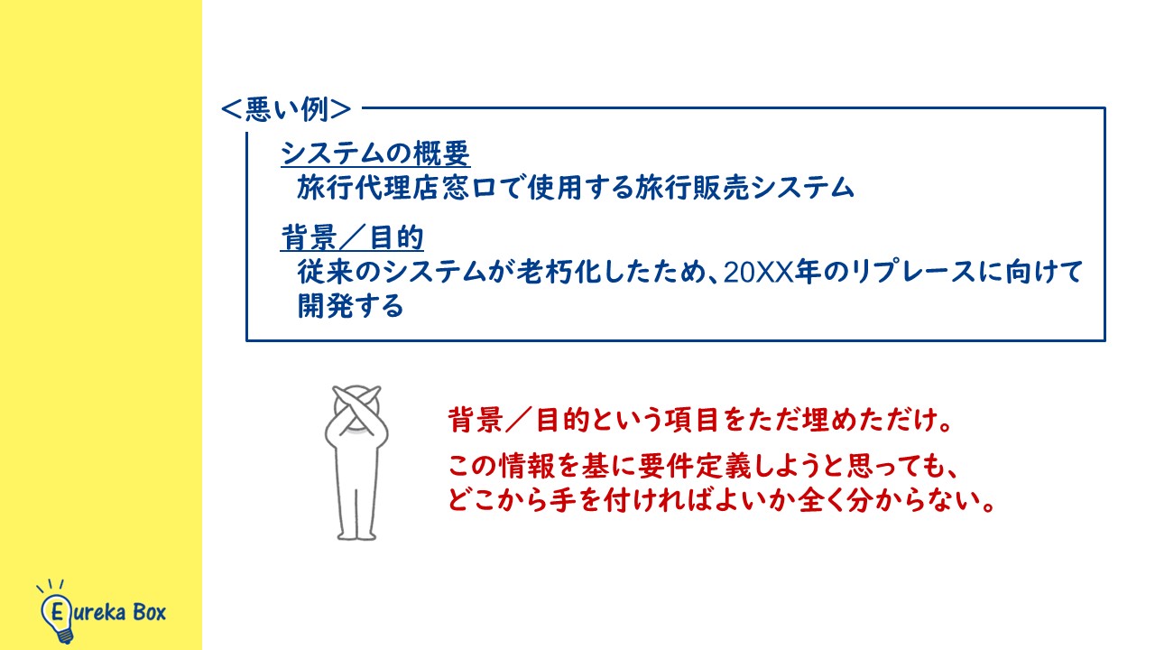 など「何を作りたいか」を宣言する部分です。要件定義を始める前にまず書く部分であり、要件定義の入力情報になります。「何を作りたいか」が曖昧になると、当然ながら機能要件、非機能要件を漏れなく正しく洗い出すことができません。