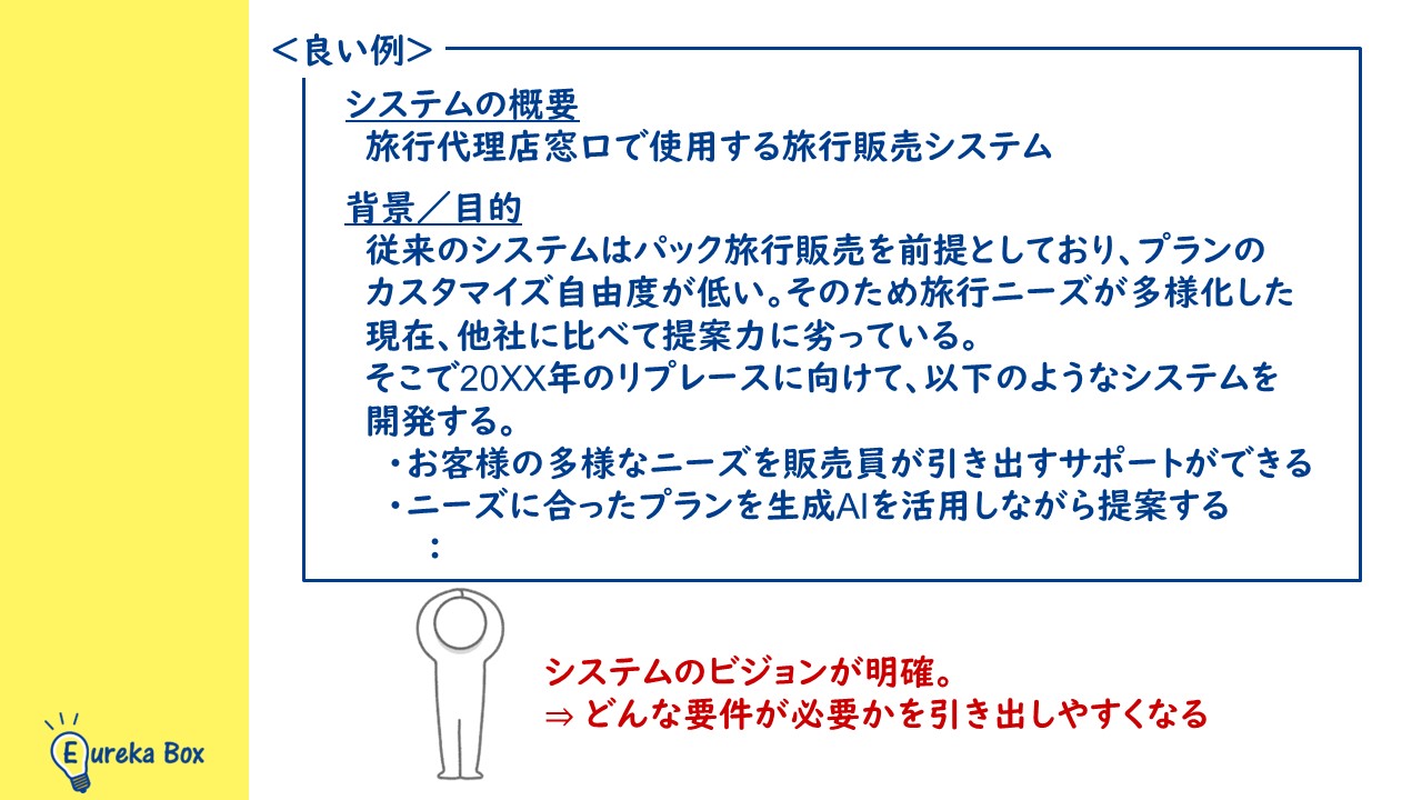 例えば上図のように背景や目的の解像度を上げてやるとビジョンが明確になり、「目的を達成するためにどんな要件が必要か」を引き出しやすくなります。「背景や目的をできるだけ具体的に書く」「ステークホルダー全員が同じゴールをイメージできるようにする」ことを意識して書きましょう。