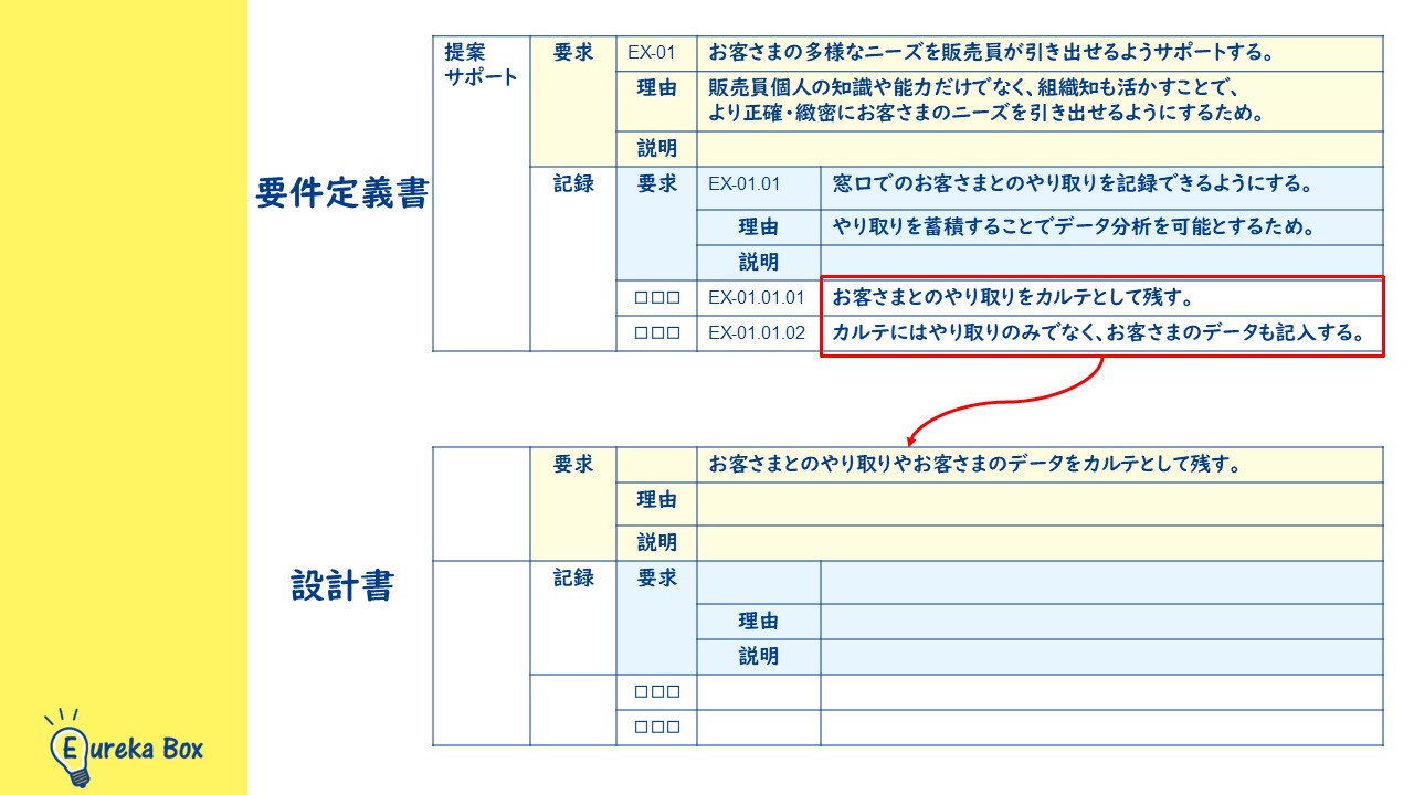- 要件が単なる一覧として書かれており、要件同士の繋がりが把握できない